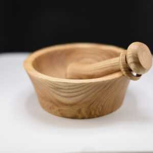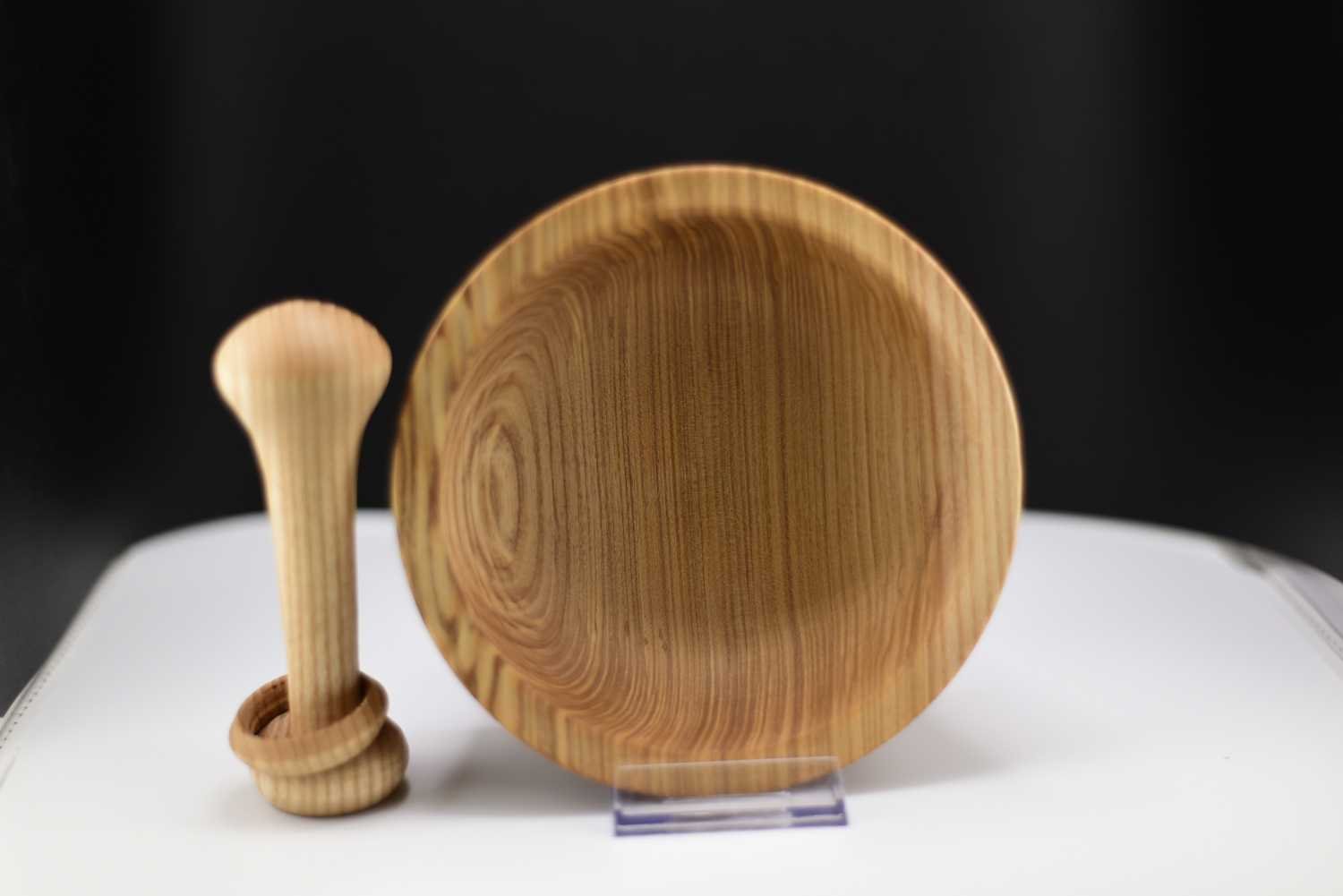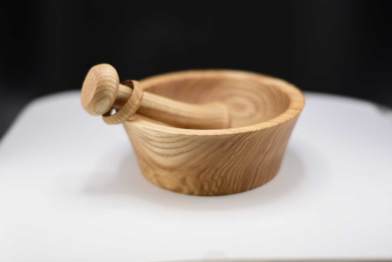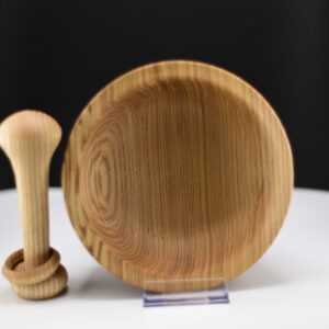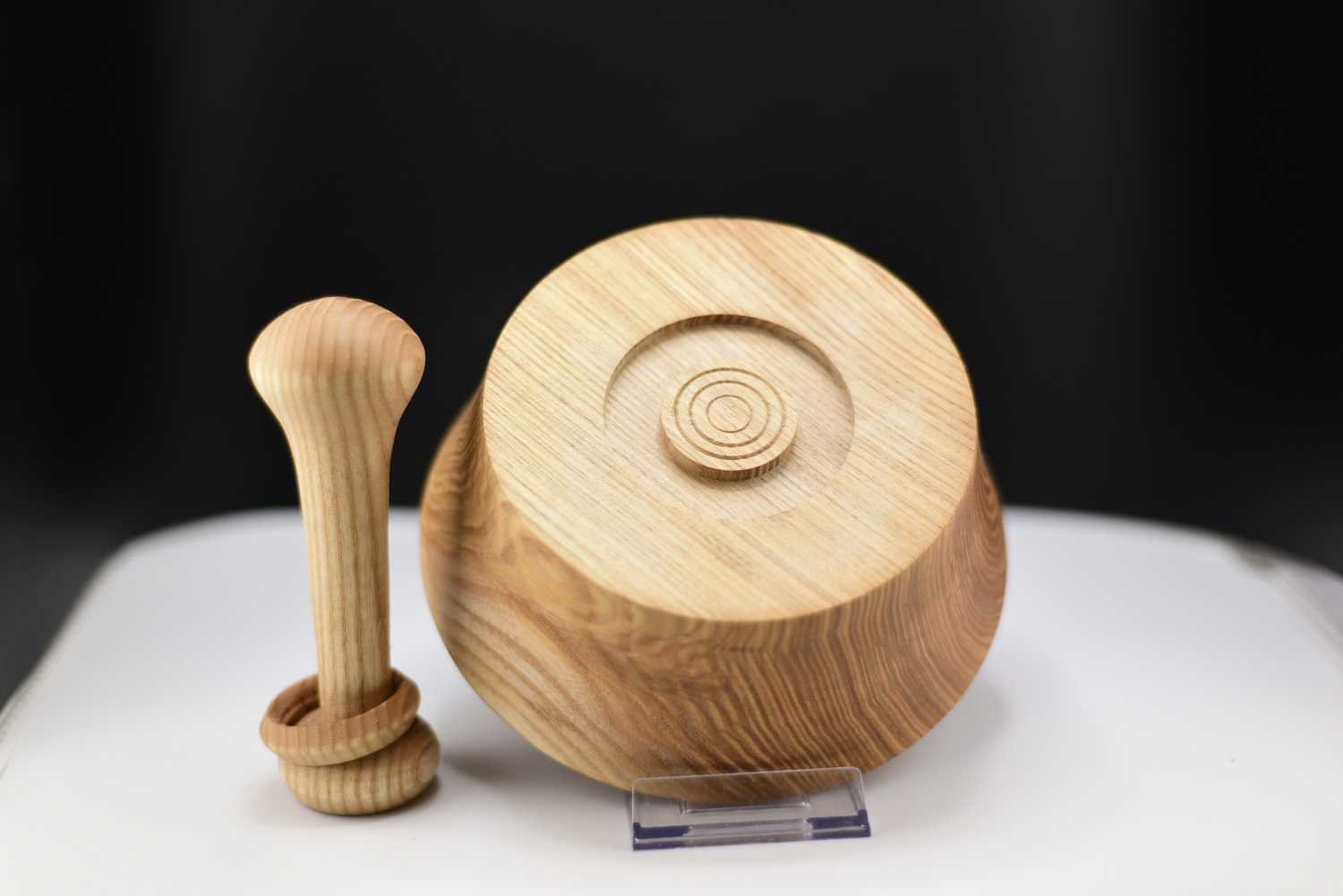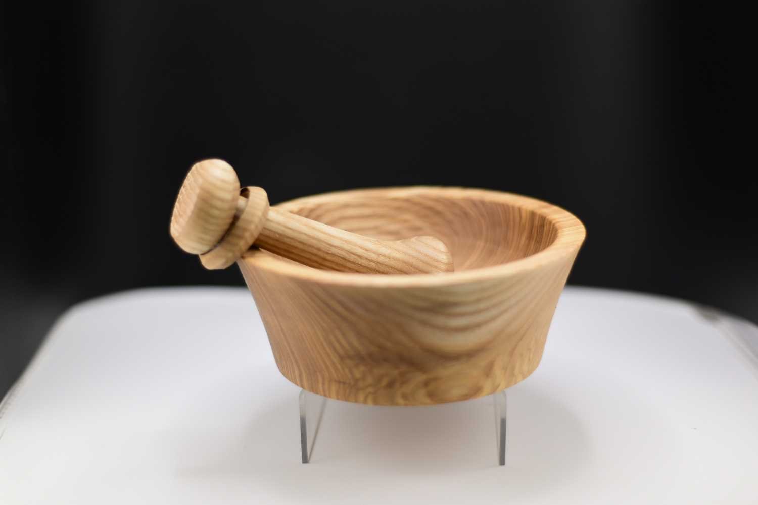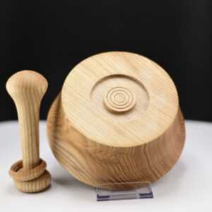 Ce mortier artisanal en frêne olivier entièrement recyclé s’accompagne d’un pilon exceptionnel orné d’un anneau prisonnier, une technique de tournage délicate qui révèle tout le savoir-faire de l’artisan ; façonné et poli à la main, l’ensemble présente des veines naturelles uniques et une finition à l’huile de pépin de raisin qui exalte la chaleur du bois, tandis que la forme ergonomique assure un broyage précis des épices, herbes ou ail ; véritable pièce d’artisanat, originale, durable et élégante, ce duo apportera caractère et authenticité à votre cuisine.