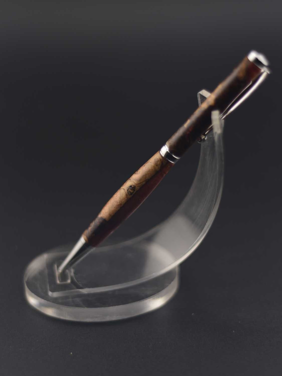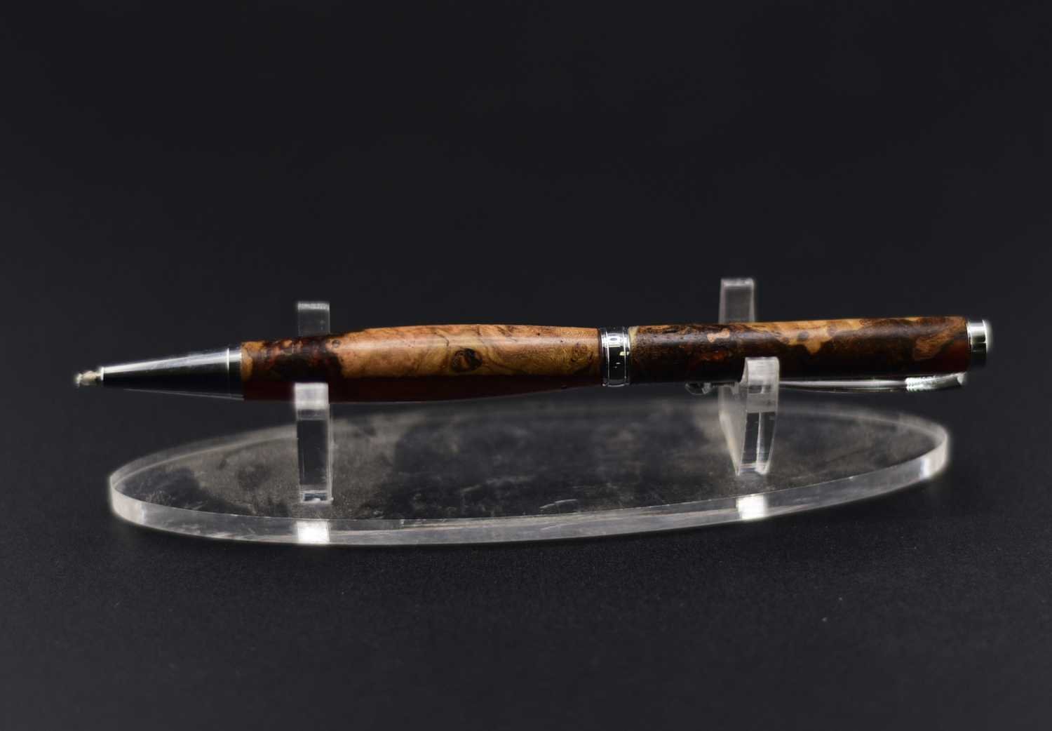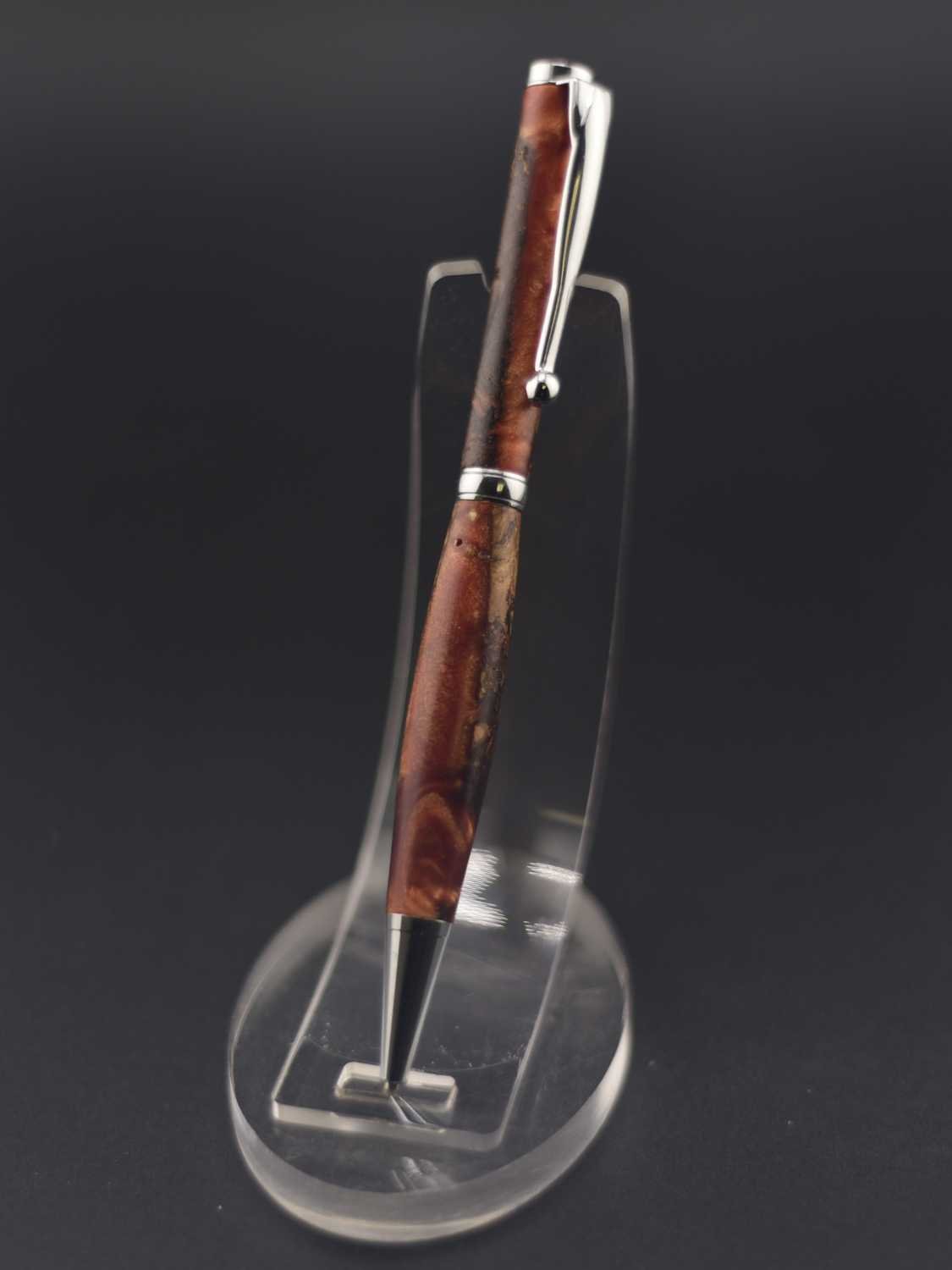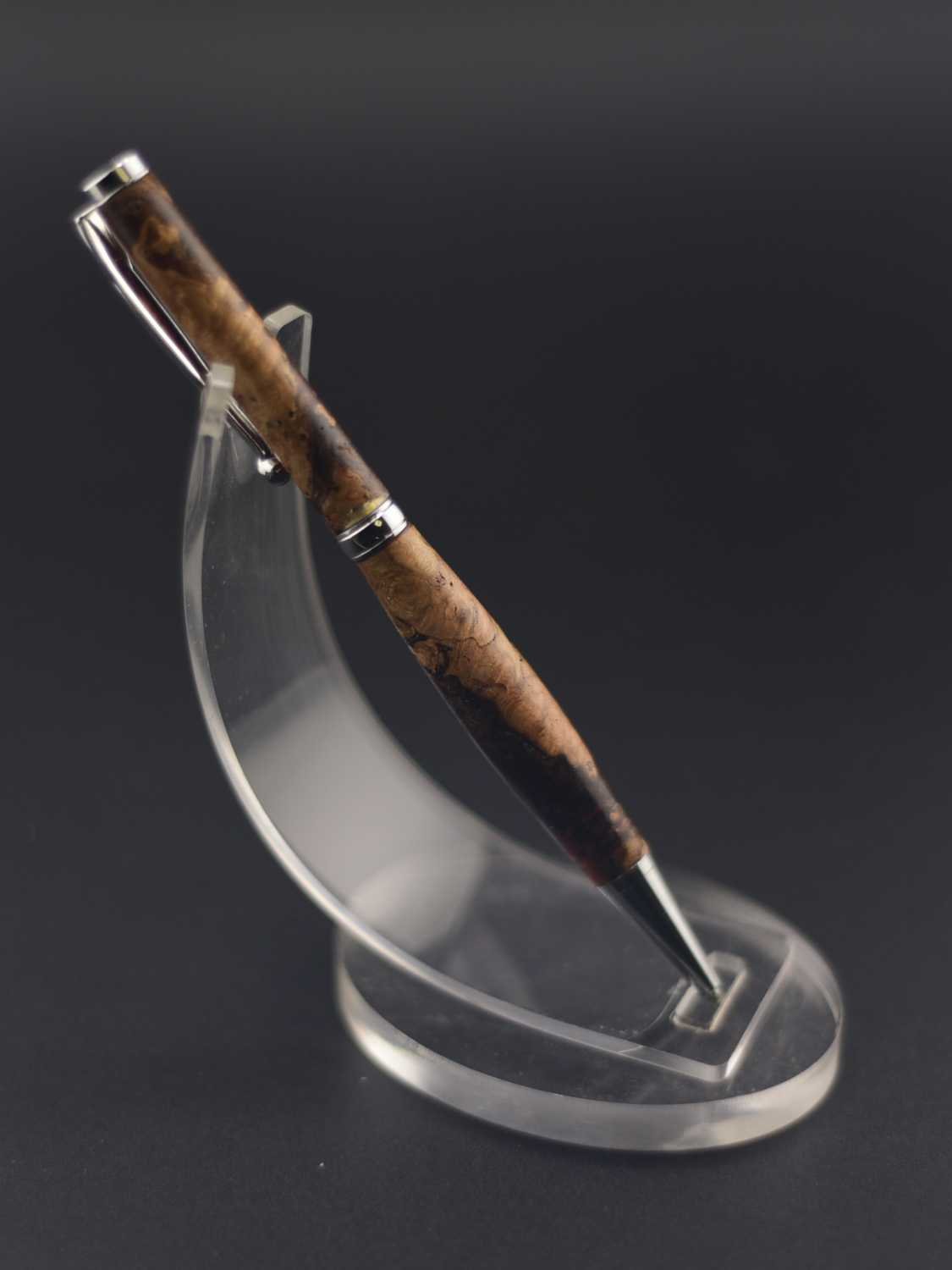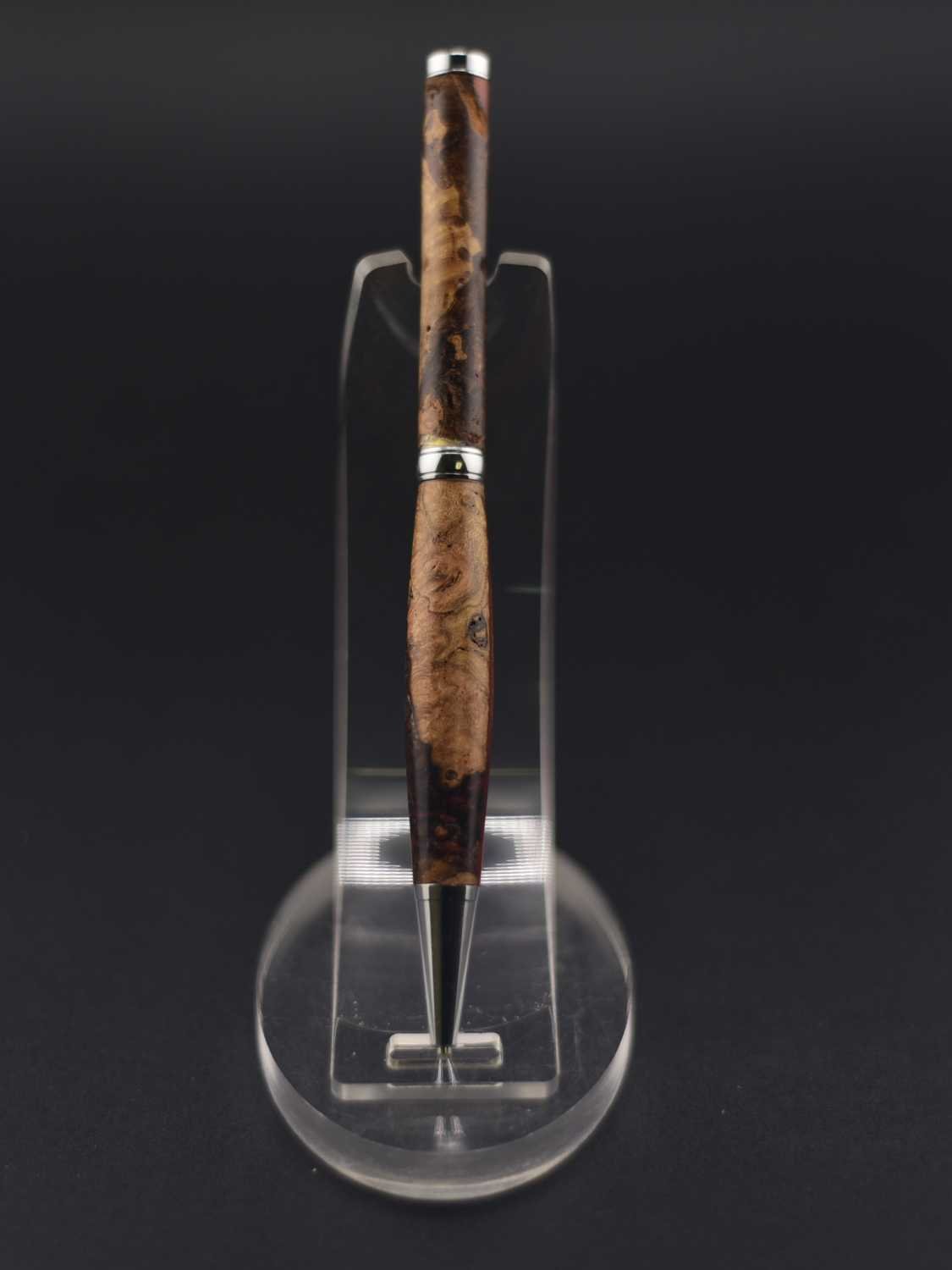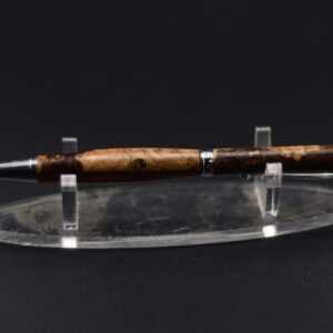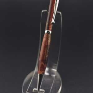 Ce stylo élégant associe la profondeur naturelle d’une loupe de bois rare à une résine marron aux nuances chaleureuses, créant un contraste raffiné et organique ; tourné à la main dans mon atelier Seewood, il reflète un savoir-faire artisanal d’exception et une mise en valeur durable des chutes de bois, tandis que son mécanisme de haute qualité assure une écriture fluide et équilibrée, et vous pouvez le personnaliser gratuitement grâce à la gravure d’un prénom ou d’un message, faisant de ce stylo une pièce unique et précieuse, parfaite pour offrir ou se faire plaisir.